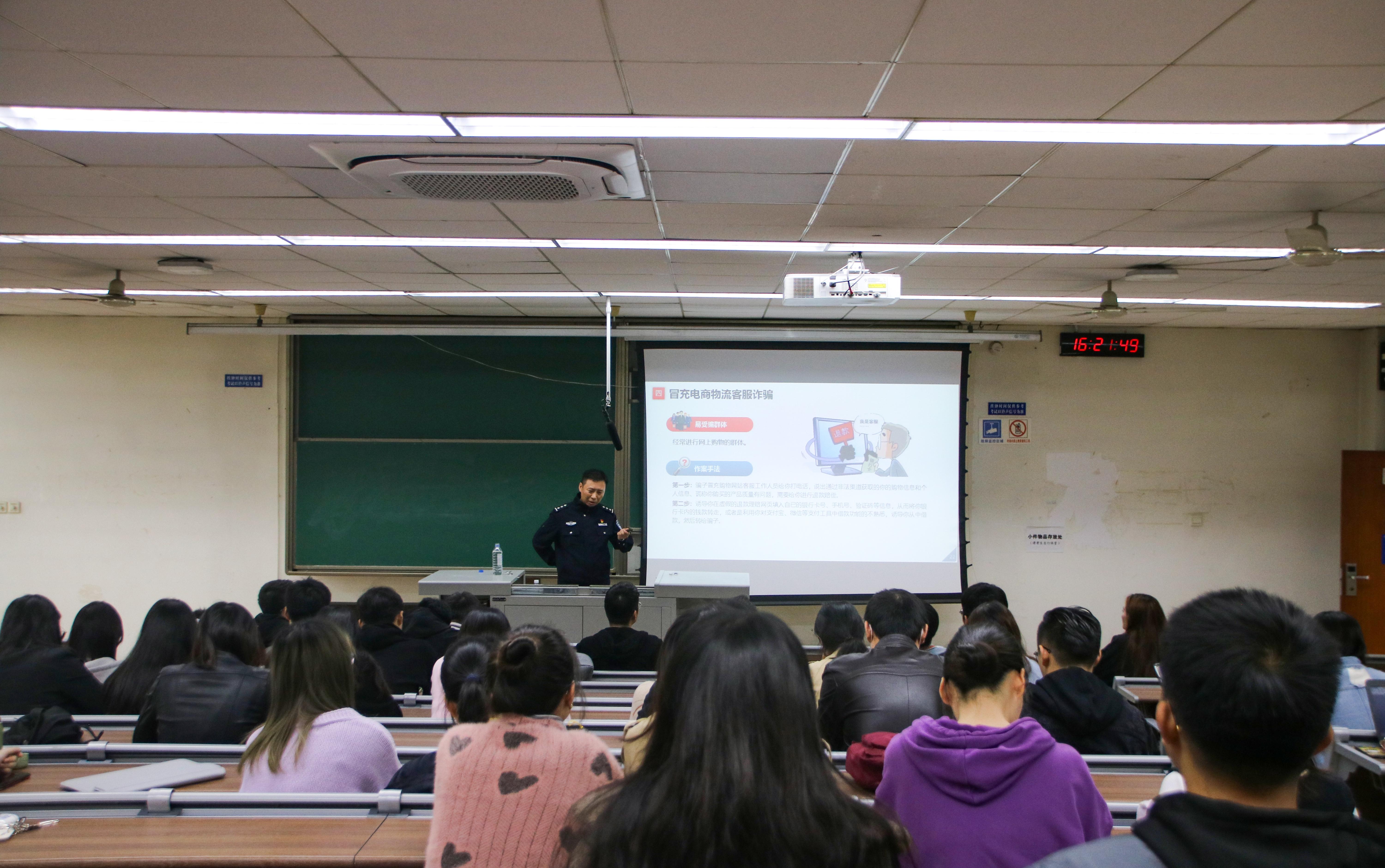 首先,赵磊警官结合多年工作经验和相关真实案例,分别从什么是电信诈骗、为什么要防范、常见的诈骗套路以及如何识别防范网络诈骗四个方面展开宣讲。他指出,当遇到无法准确确认对方身份的人、电话短信网络等见不到真人的沟通方式以及要求汇款转账和输入敏感信息等情况,即很可能已遇到诈骗,应提高警惕,不要盲目听信对方要求,及时寻求老师同学家人帮助或咨询警方。随后,赵磊警官着重介绍了常见的网络电信诈骗包括校园贷诈骗、“杀猪盘”诈骗以及冒充“公检法”诈骗等诈骗类型,并逐一有针对性地讲解防范应对方法。