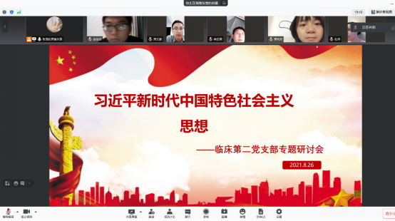 2021年8月26日晚20:00,威尼斯娱人中国临床第二党支部全体成员举行了线上专题研讨会,会议围绕“深入学习领会习近平新时代中国特色社会主义思想”进行交流讨论,会议由党支部书记张雪主持,支部各位党员结合自身实际,发表了对习近平新时代中国特色社会主义思想的理解与认识。